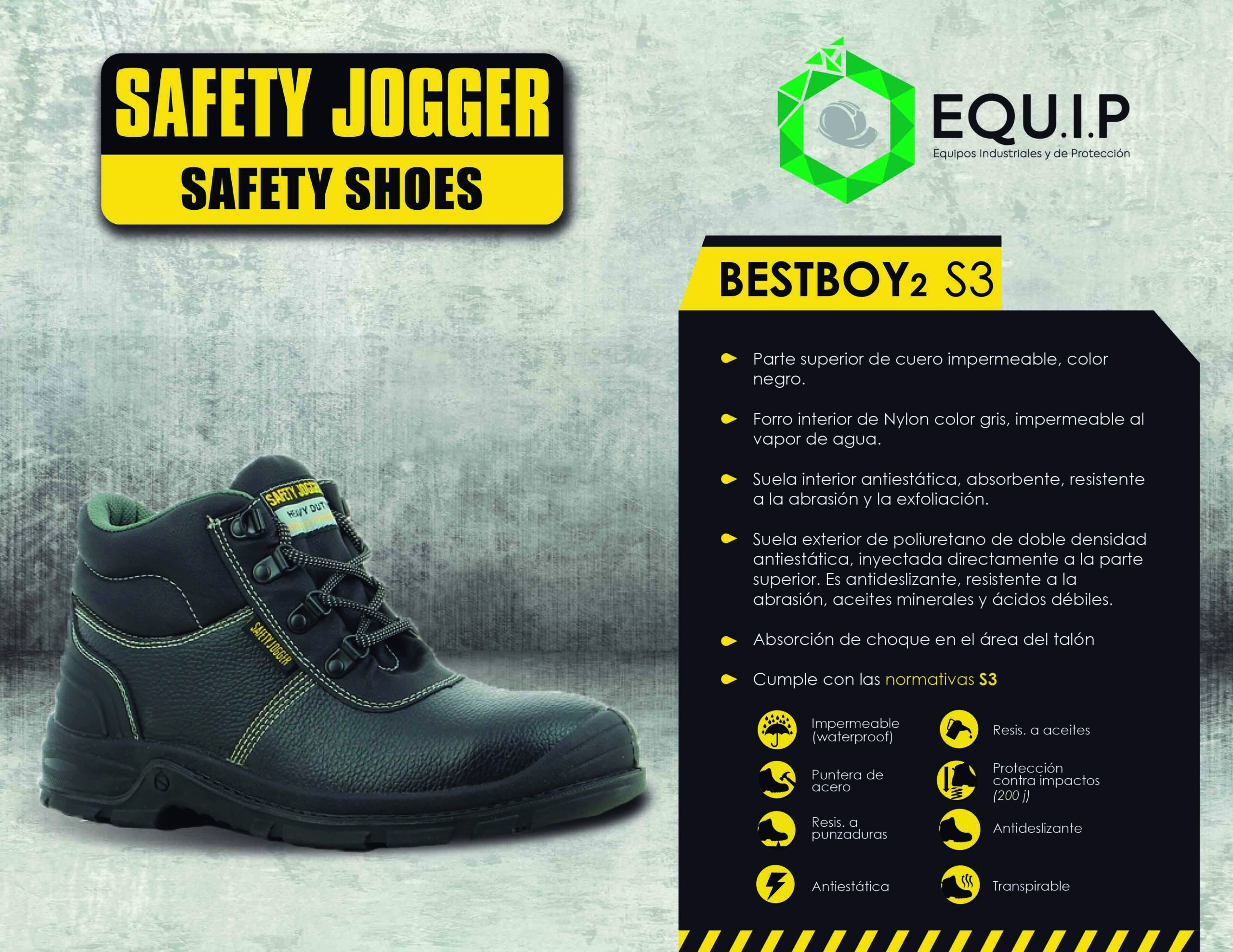 Parte superior de cuero impermeable, color negro. Forro interior de Nylon color negro, impermeable al vapor de agua. Suela interior antiestática, absorbente, resistente a la abrasión.